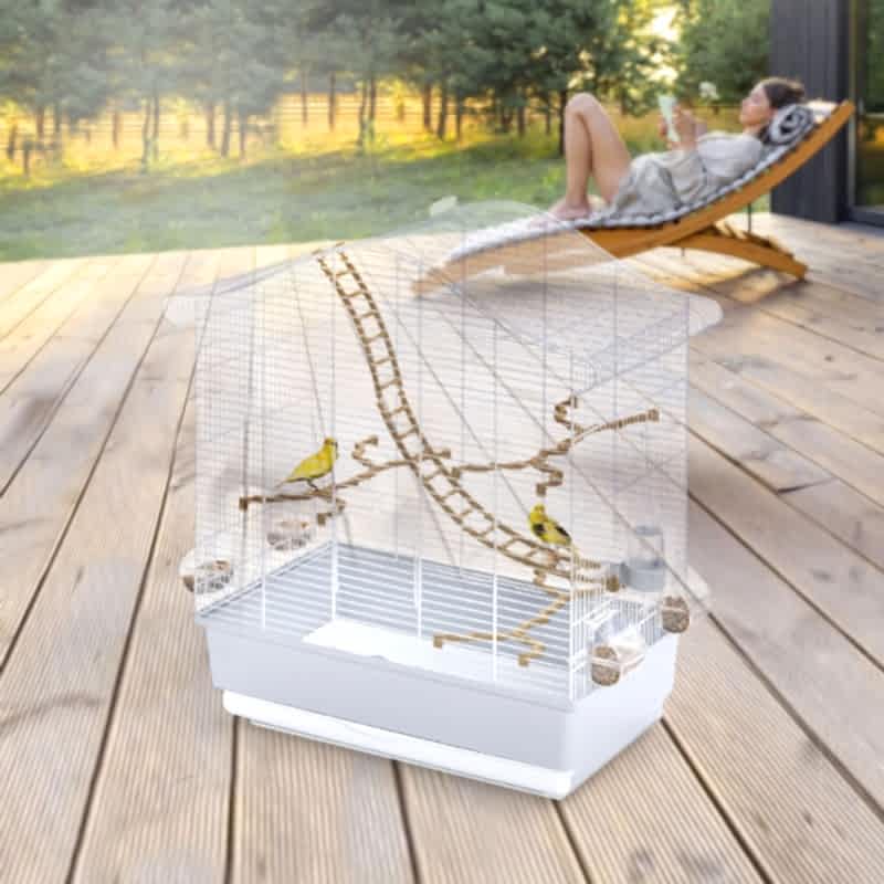 Elettra kafesi, kanaryalar, muhabbet kuşları ve egzotik türler gibi kuşları barındırmak için tasarlanmış dikdörtgen bir tabana ve eğimli bir çatıya sahiptir. Basit tasarımı, onu hem işlevsel hem de estetik açıdan hoş kılan hoş bir renkle tamamlanmıştır. Elettra kafesi, kolay periyodik temizlik için pratik, çıkarılabilir bir çekmece ile donatılmıştır. Alt kısım, kullanışlı yan klipsler kullanılarak tamamen ayrılabilir. Çatıdaki bir tutamak, kafesi taşımayı kolay ve zahmetsiz hale getirir. Kuşlarınız için maksimum konforu sağlamak için kafes, gerekli tüm aksesuarlarla birlikte gelir: üç dal şeklinde tünek, bir Tibet merdiveni, bir Tweety 100 suluk ve dört Mia yemliği. Şeffaf plastik Mia yemlikleri, içerideki yiyecek seviyesini izlemenizi sağlar. Daha fazla rahatlık için, döner tekerlekli isteğe bağlı Portagabbie 203 standı, kafesi herhangi bir yere zahmetsizce taşımanızı sağlar.