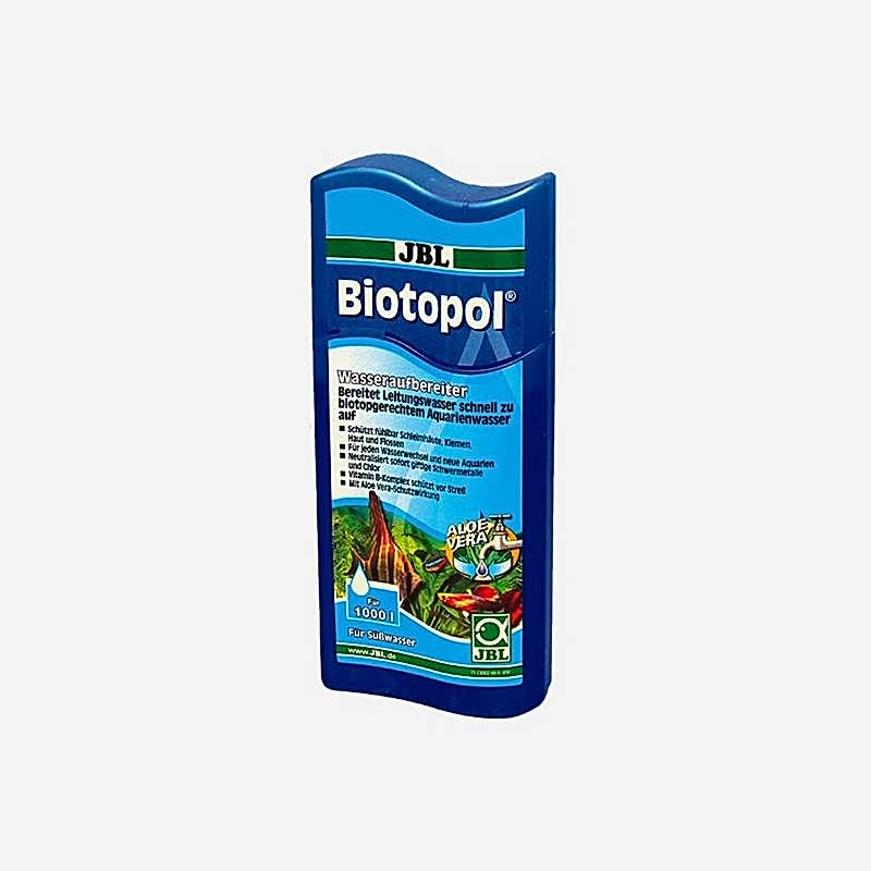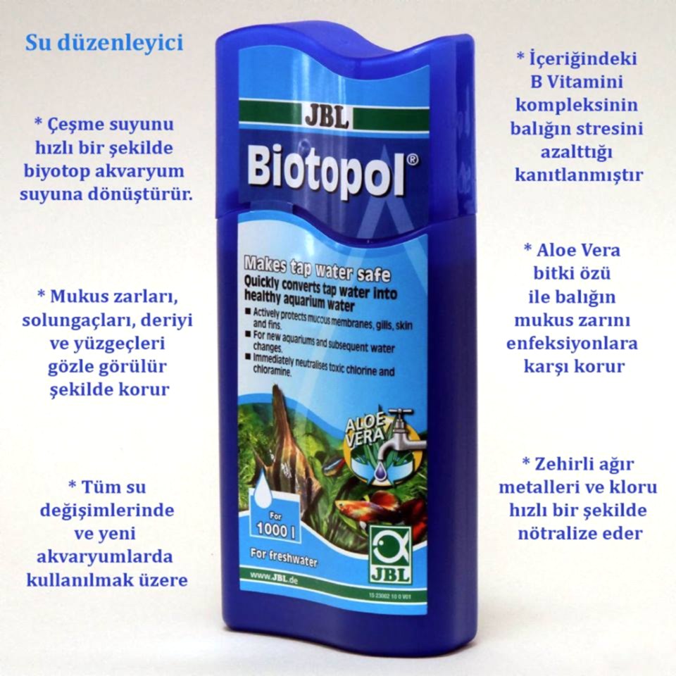 Birçok akvaryum sever musluk sularının klorlanmadığını zanneder. Fakat bu yanlıştır: su evinize ulaşırken birçok farklı kanaldan geçtiği için içine yüksek miktarda klorin atılmaktadır. Musluk suyuna klor katılmamış olsa bile, suyun dezenfekte edilmesi ve içilebilir hale gelmesi için birçok farklı madde atılmaktadır. Bu durumda, ağır metallerin etkisiz hale getirilmesi için JBL Biotopol kullanılmasını şiddetle tavsiye ederiz. JBL Biotopol'ün diğer bir önemli özelliği de aloe vera (bitki özü) içermesidir. Hem insan cildine hem de balıklara yararı olan bir bitki özüdür.