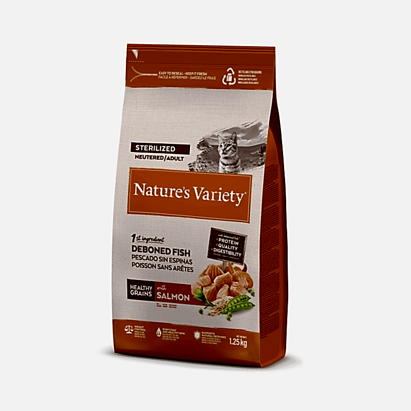 Kılçıksız somon* (%20), kurutulmuş somon proteini (%12), Esmer pirinç* (%12), mısır proteini, kurutulmuş bezelye* (%12), Patates proteini, Kurutulmuş ton balığı proteini (%4), yulaf* (%4), kümes hayvanı yağı* (3,%5), hidrolize protein (3%), mineraller, kurutulmuş havuç* (%0,5 = %4 taze havuç), kurutulmuş elma* (%0.3 = %2 taze elma).*Doğal bileşenler.
