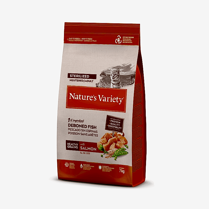 Kılçıksız somon* (%20), kurutulmuş somon proteini (%12), Esmer pirinç* (%12), mısır proteini, kurutulmuş bezelye* (%12), Patates proteini, Kurutulmuş ton balığı proteini (%4), yulaf* (%4), kümes hayvanı yağı* (3,%5), hidrolize protein (3%), mineraller, kurutulmuş havuç* (%0,5 = %4 taze havuç), kurutulmuş elma* (%0.3 = %2 taze elma).*Doğal bileşenler.