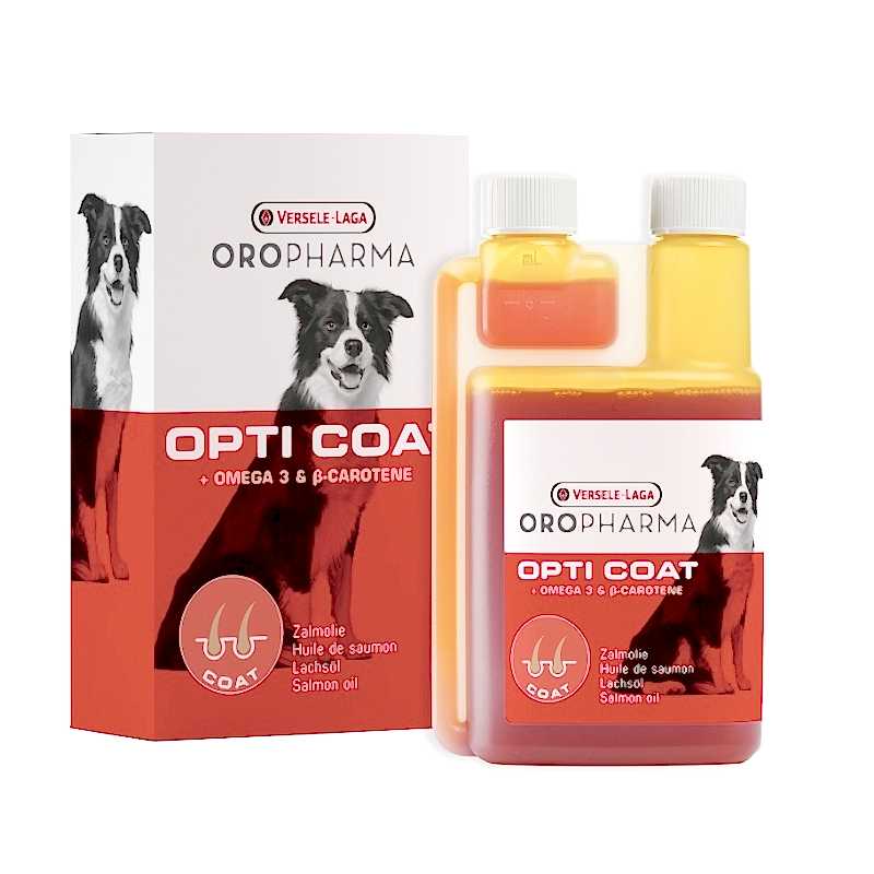 Oropharma Opti Coat, somon yağı bazlı %100 doğal bir besin takviyesidir. Sezon dışında tüy dökümünü sınırlar, kuru ve pul pul bir cilt oluşmasını engeller.